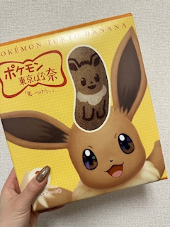 おいっすうう〜 りりかです ☺️ 見て欲しいこの東京バナナ🍌 会社の人からお土産でイーブイのバナナもろた 😍 これ、中身のバナナもイーブイの絵が書いてあるんよ👀 超絶可愛すぎるᐡ⸝⸝> ̫ <⸝⸝ᐡ 食べるのがもったいないけど 食べちゃうよね 😆😆 いただきまああす 😋 りりか